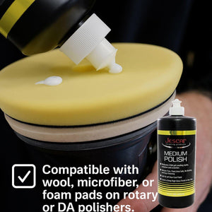 Jescar Medium Polish can be used with rotary or dual-action polishers and is compatible with wool, microfiber, or foam pads. For best results, use with Jescar Yellow Foam Polishing Pad.