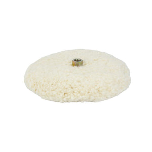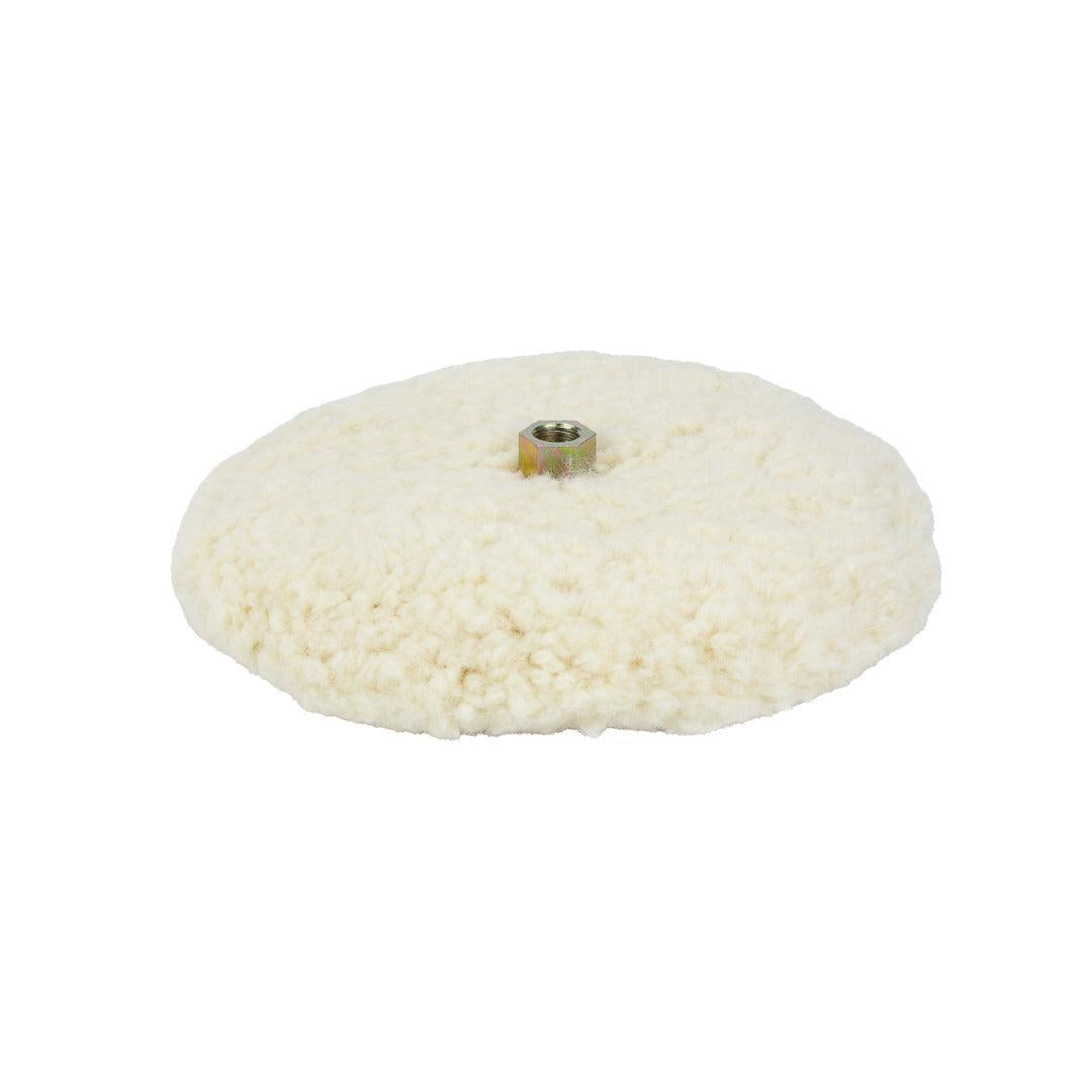 The double-sided wool cutting pad secures directly to the spindle of a rotary polisher with the standard 5/8in thread.