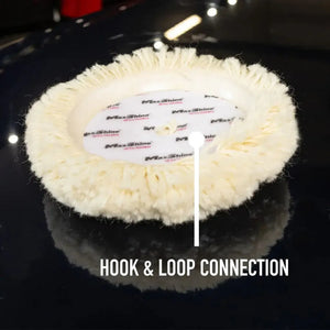 The single-sided wool buffing pad attaches to your 7in backing plate with the standard hook and loop connection.